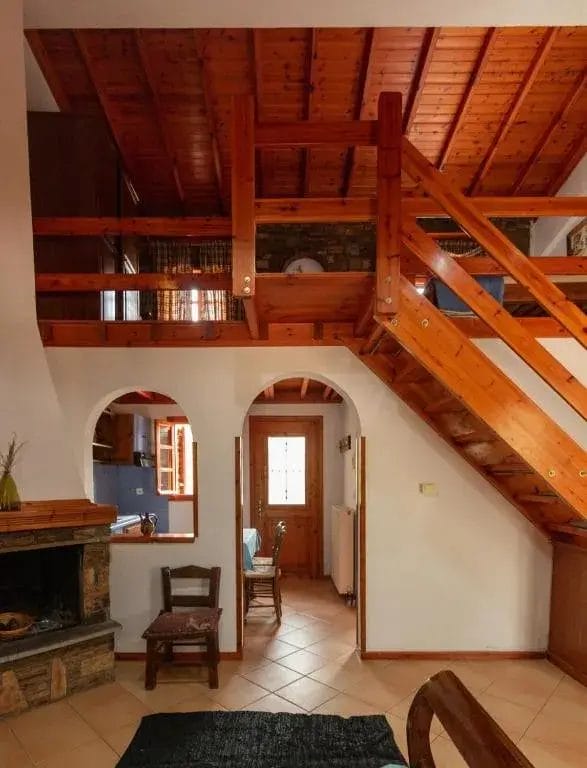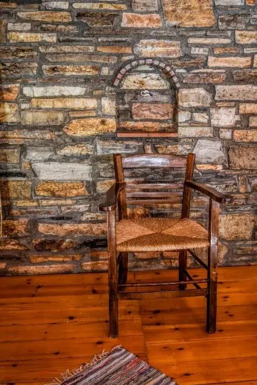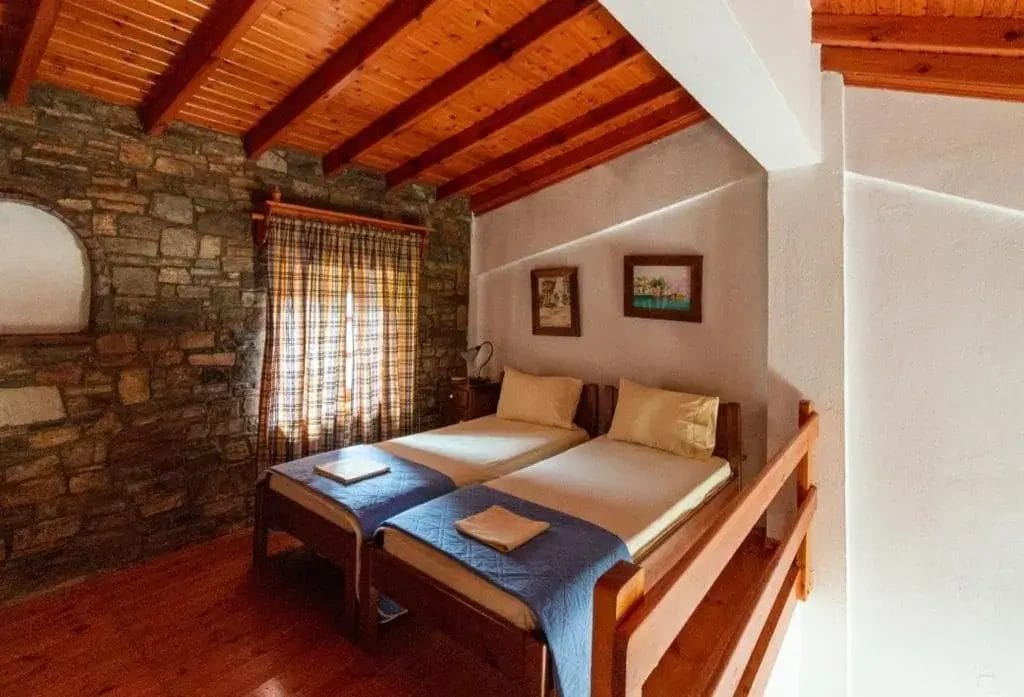 The villas have a beautiful neoclassical design with stone features and elegant furniture, offering a unique and peaceful atmosphere.