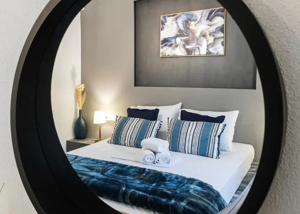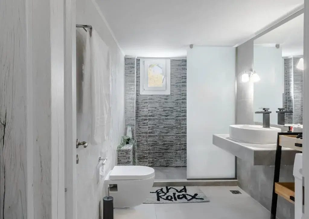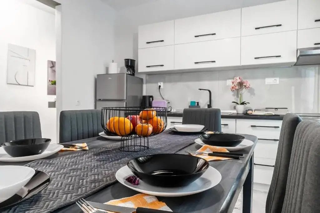 Margio Bay Apartment also boasts a fully equipped, modern kitchen with all necessary utensils and cookware, a dining area, and a sleek bathroom with a walk-in shower.