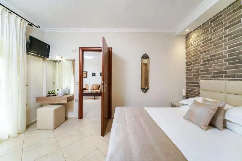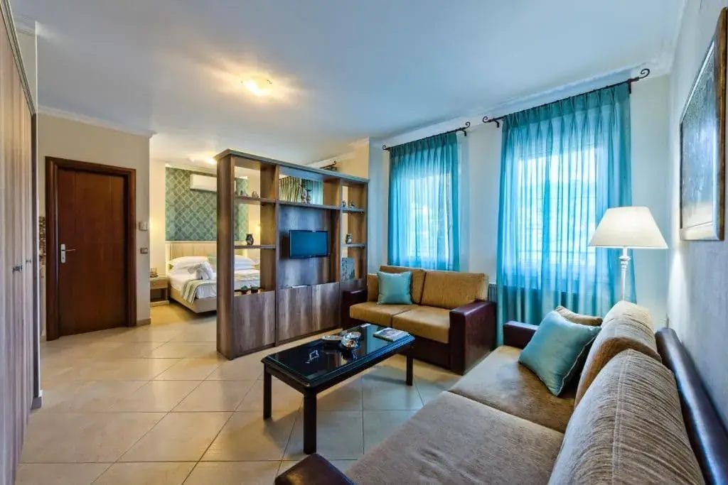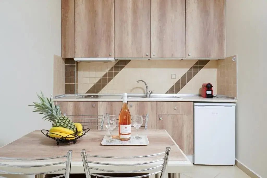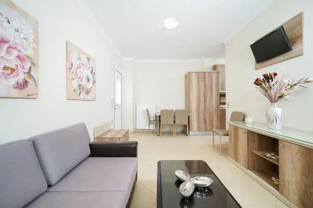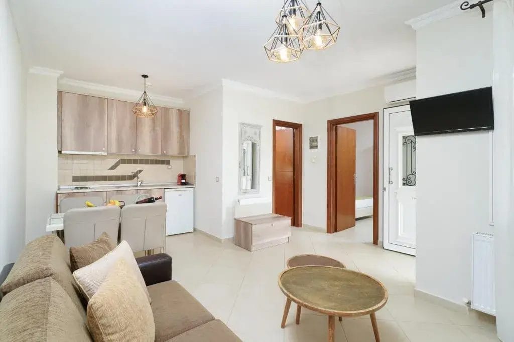 All apartments and studios are fully equipped with essential cooking and kitchenware, private bathrooms, and their own outdoor spaces, such as balconies or terraces with seating areas.